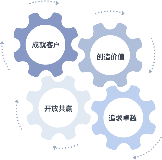 成就客户是一切决策的出发点,,,,创造价值是衡量所有工作的标准,,,,追求卓越是我们做事做人的态度,,,,开放共赢是我们的格局也是最终的结果。。价值观的齿轮环环相扣,,,,推动着组织里的每个人不断向前。。。