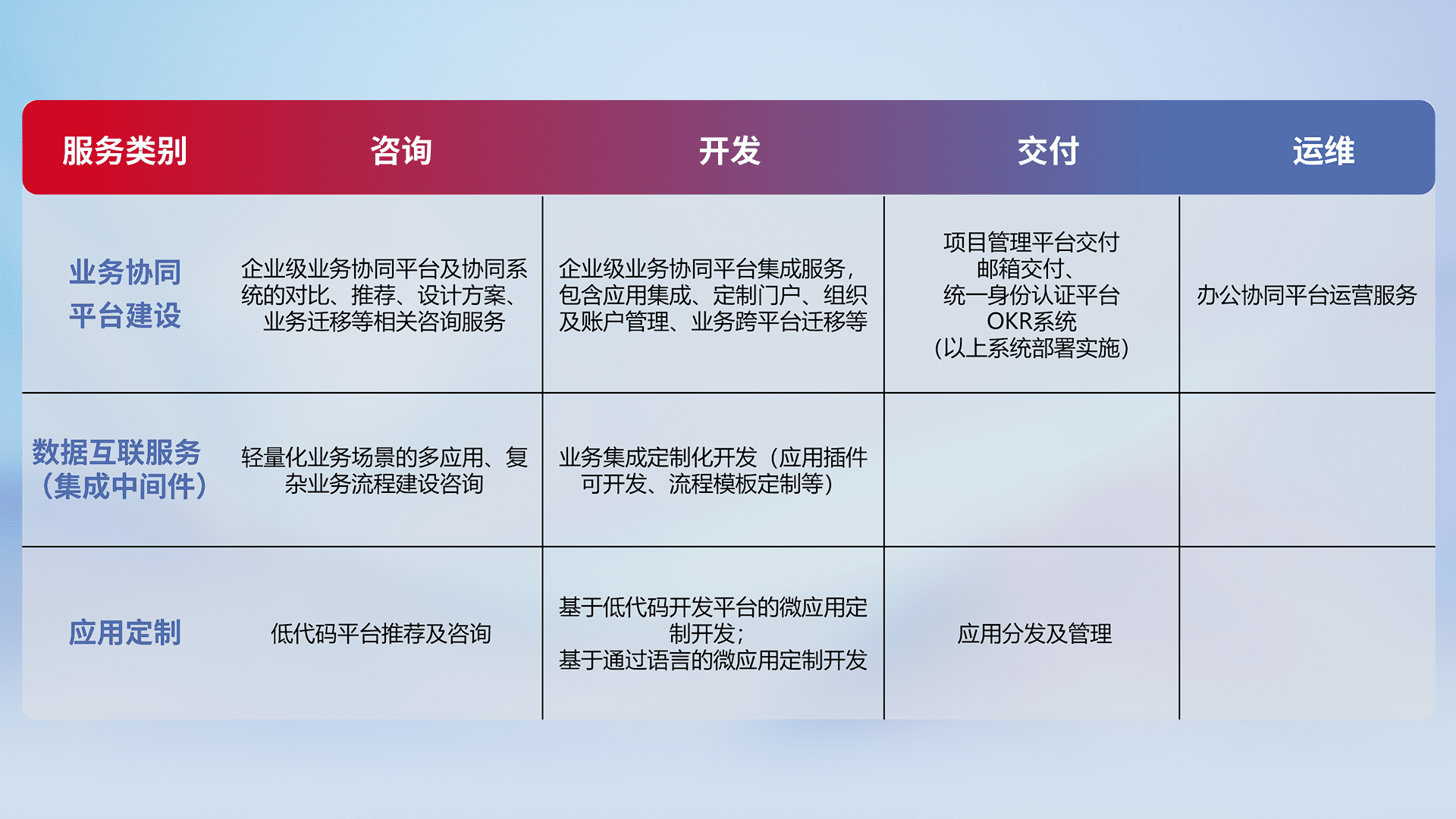 针对钉钉、、、、企微、、IDaas等平台级产品提供产品的规划、、方案、、、、交付、、、定制化开发等服务,,实现如统一协同办公、、智能客户服务、、、、混合会议管理、、、、智能数据查询、、、等业务场景,,,实现数字化转型。。
